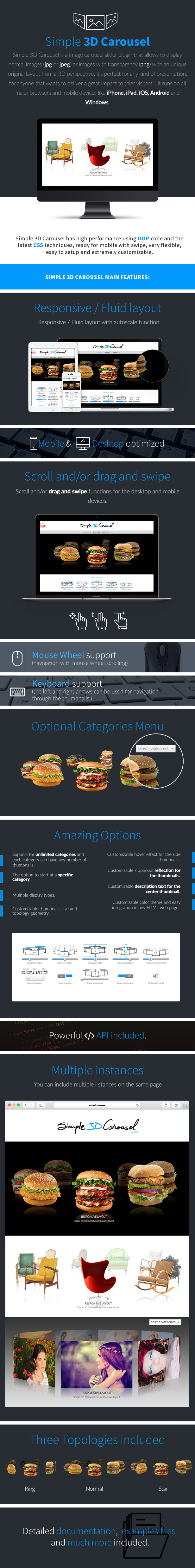 Simple 3D Carousel WP Plugin is a image carousel slider WP plugin that allows to display normal images (jpg or jpeg) or images with transparency (png) with an unique original layout from a 3D perspective. It’s perfect for any kind of presentation, for anyone that wants to deliver a great impact to thier visitors. It runs on all major browsers and mobile devices like iPhone, iPad, IOS, Android and Windows. When a thumbnail is clicked you can choose to do nothing or open a new web page. Simple 3D Carousel WP Plugin has high performance using OOP code and the latest CSS techniques, ready for mobile with swipe, very flexible, easy to setup and extremely customizable.