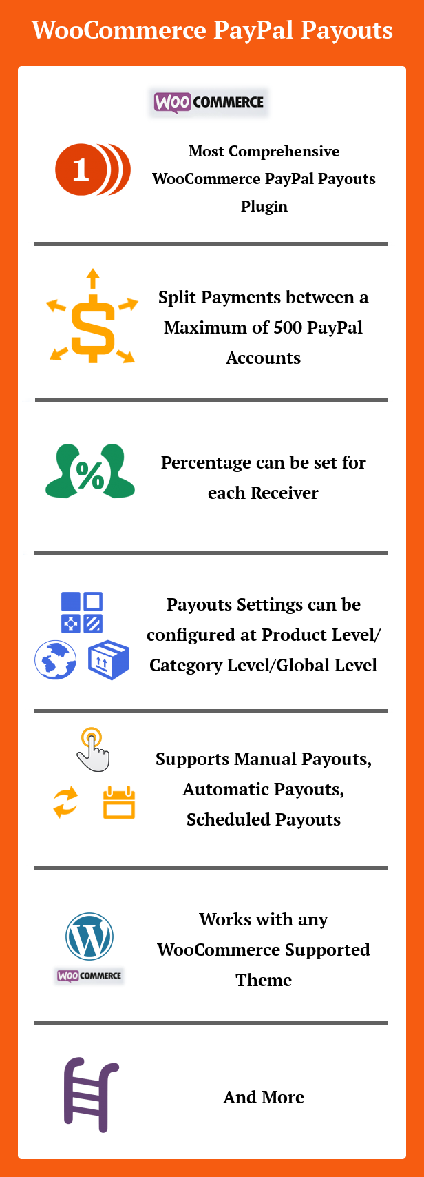 WooCommerce PayPal Payouts is a WooCommerce Plugin that uses the PayPal Payouts API in order to split the payments and send to multiple PayPal Accounts(max 500 receivers per API call). Payouts settings can be configured at Product Level, Category Level and Global Level. The main(Admin) PayPal Account should be a Business account to use WooCommerce PayPal Payouts.
